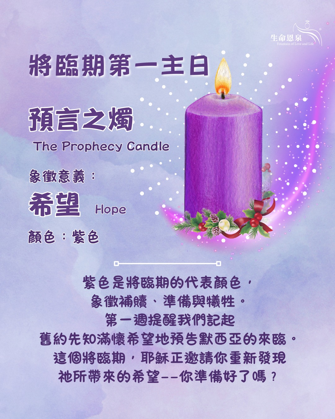 紫色是將臨期的代表顏色,象徵補贖、準備與犧牲。第一週提醒我們記起舊約先知滿懷希望地預告默西亞的來臨。這個將臨期,耶穌正邀請你重新發現祂所帶來的希望——你準備好了嗎?