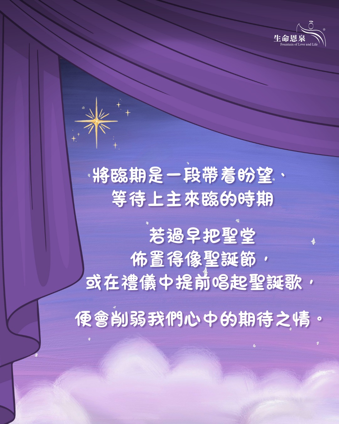 第一主日彌撒開始時,主禮會為將臨環舉行祝福禮。 - 將臨期是一段帶着盼望、等待上主來臨的時期。若過早把聖堂佈置得像聖誕節,或在禮儀中提前唱起聖誕歌,便會削弱我們心中的期待之情。