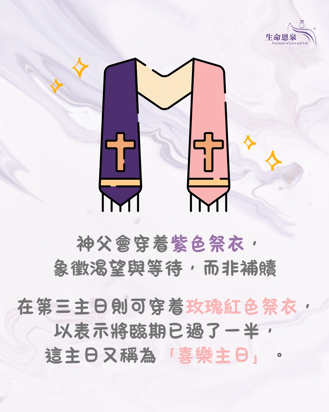 - 神父會穿着紫色祭衣,象徵渴望與等待,而非補贖。在第三主日則可穿着玫瑰紅色祭衣,以表示將臨期已過了一半,這主日又稱為「喜樂主日」。