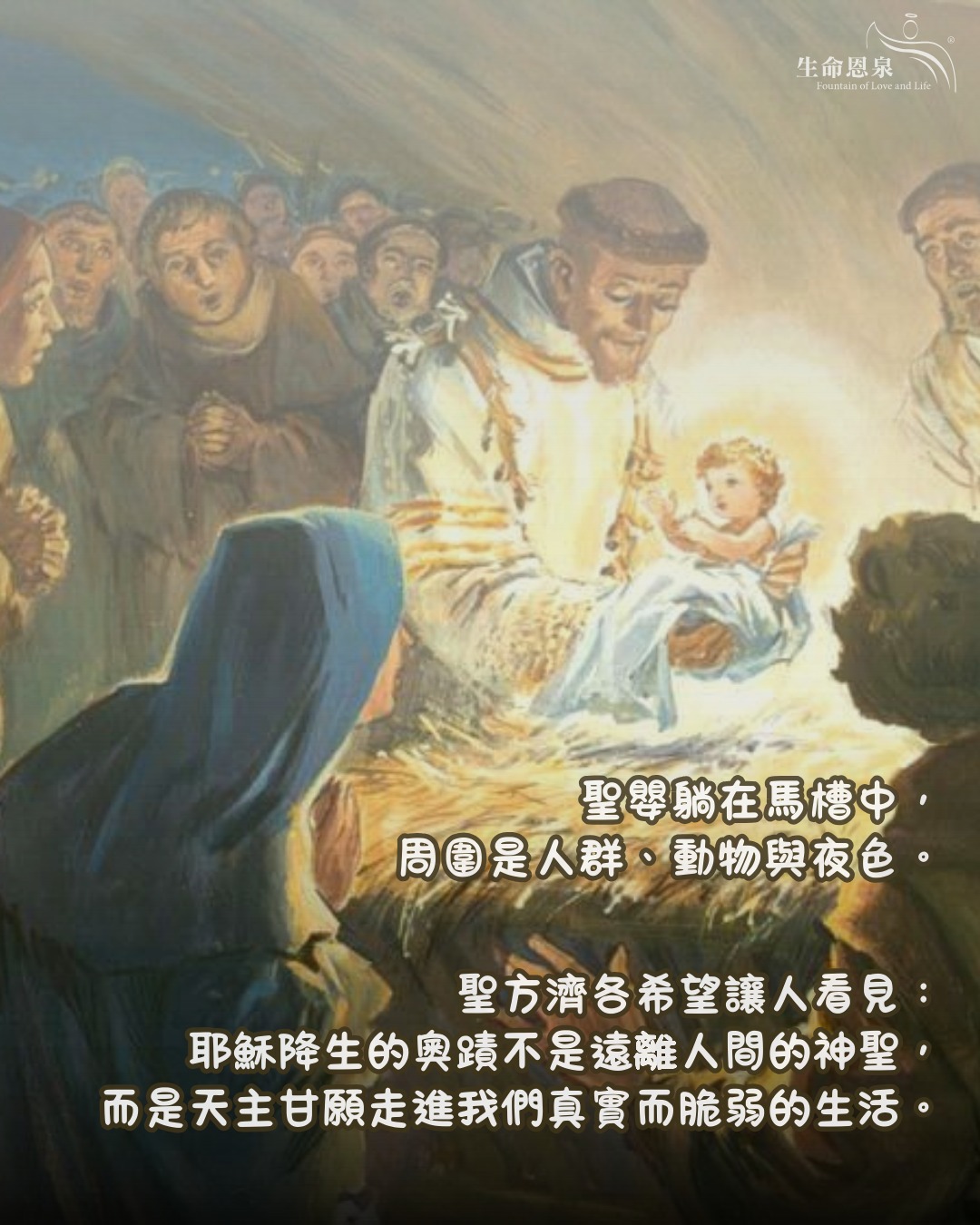 ⭐ 聖嬰躺在馬槽中,周圍是人群、動物與夜色。聖方濟各希望讓人看見:耶穌降生的奧蹟不是遠離人間的神聖,而是天主甘願走進我們真實而脆弱的生活。
